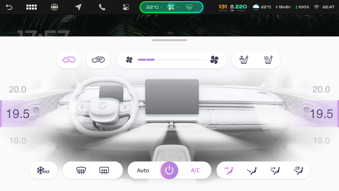 Строка состояния объединяет все ключевые элементы управления и информации: кнопки Home и «Назад», быстрый доступ к навигатору, звонку, меню авто и пресетам, а также регулировку климата, расчёт запаса хода и мониторинг энергопотребления. Она всегда показывает уровень заряда батареи, температуру за бортом и текущее время, позволяя вам не отвлекаться от дороги и сразу реагировать на любые изменения.