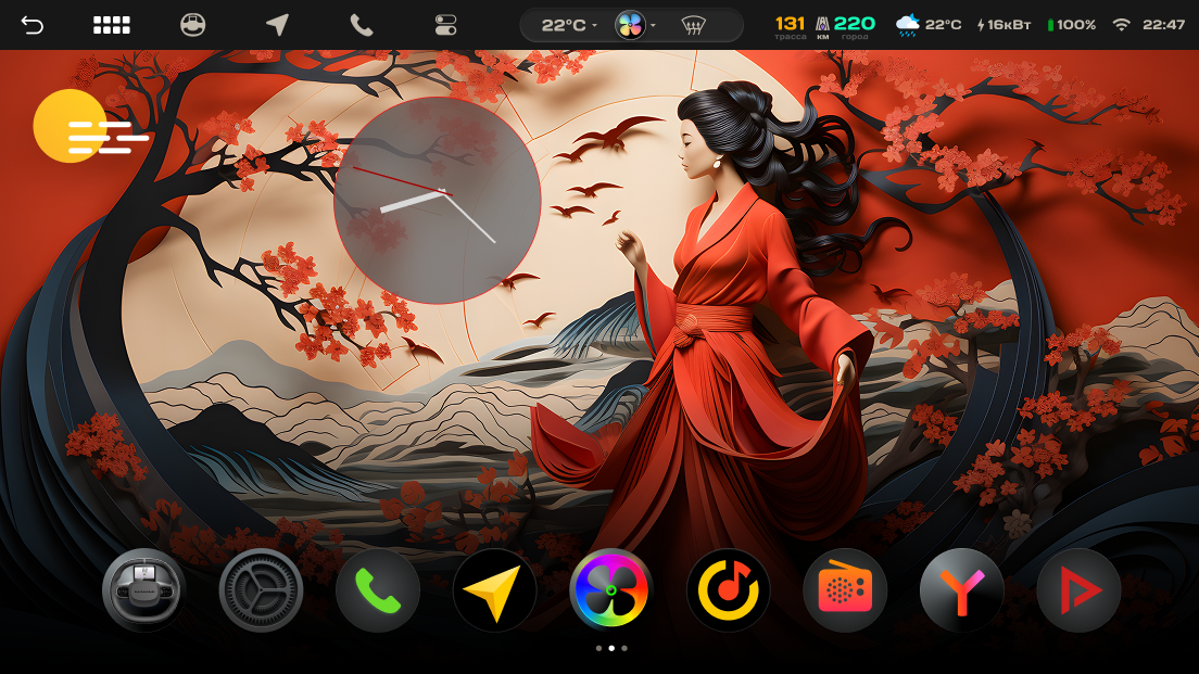 Launcher BOX открывает новые возможности для настройки вашего электромобиля. Теперь у вас три рабочих стола: дневной со светлой темой, ночной с тёмной — для комфортного просмотра в любое время суток, и отдельный экран для быстрого доступа к установленным приложениям одним касанием.
